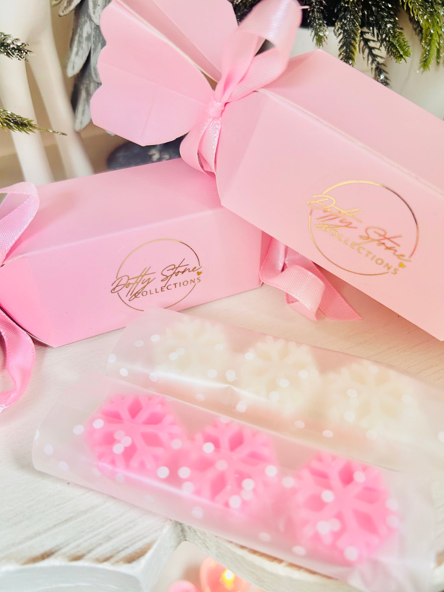 These adorable mini pink crackers make the perfect stocking fillers with 6 festive wax melt snowflakes.